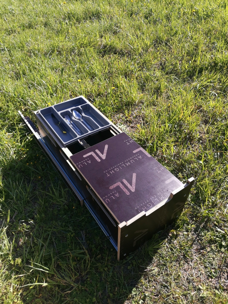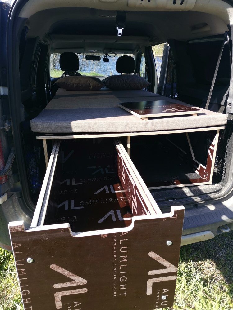 Ящик выдвижной для Модуля для сна Ларгус Трэвел Бокс Лайт изготовлен из коричневой ламинированной фанеры с надписью толщина 15мм. Направляющие на 40кг шариковые полного выдвижения, стоимость 14000 рублей, (акционная цена первые 5 штук)